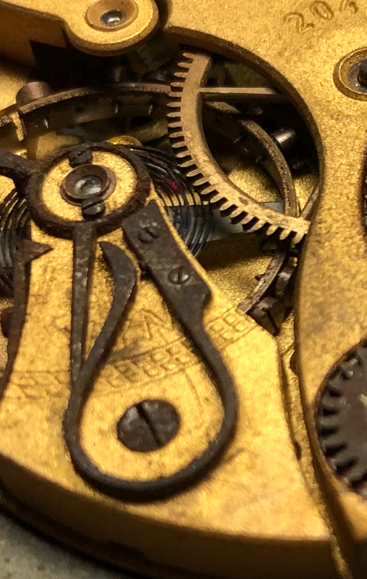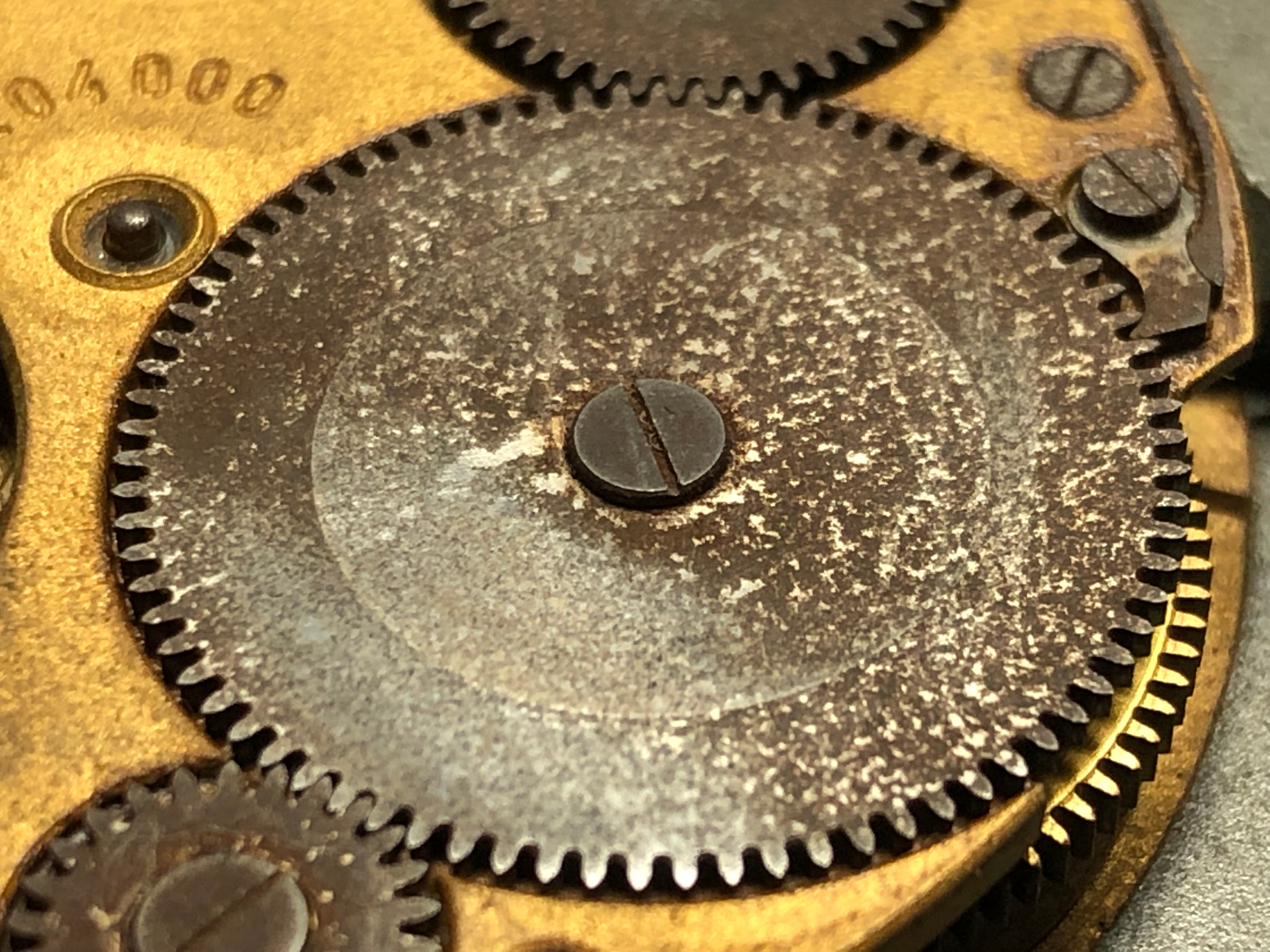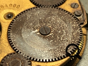 Das selbe Uhrwerk. Kronenrad und Sperrad nach dem entrosten und anbringen eines neuen Sonnenschliffes.