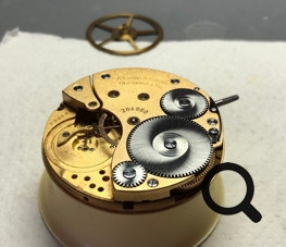 Bei dem Wempe Ankerchronometer Nr. 3453 musste im Rahmen der Revision ein Zapfen in die Uhruhwelle neu eingebohrt werden. In dem Video rechts sieht man wie schön es jetzt wieder läuft.
