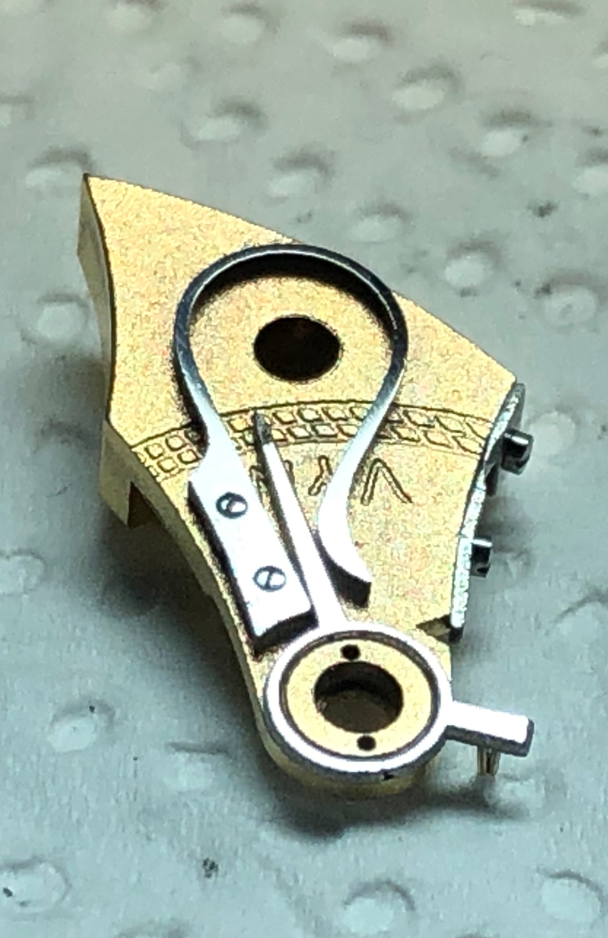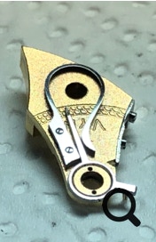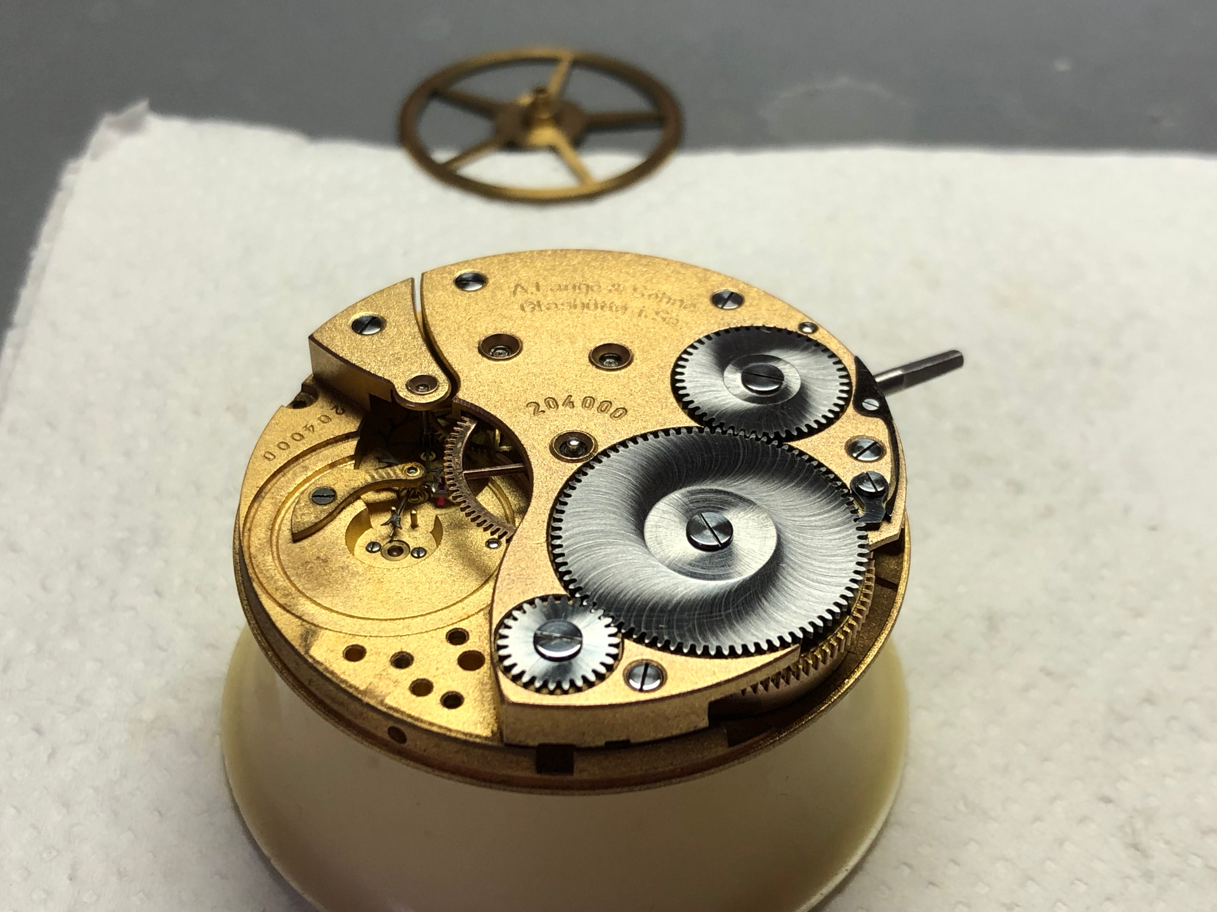 Eine Schwanenhalsfeinregulierung in einem Uhrwerk Lange und Söhne Kaliber 48. Das Werk war stark rostig. Vor und nach der Restauration.