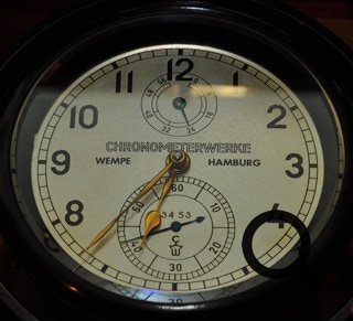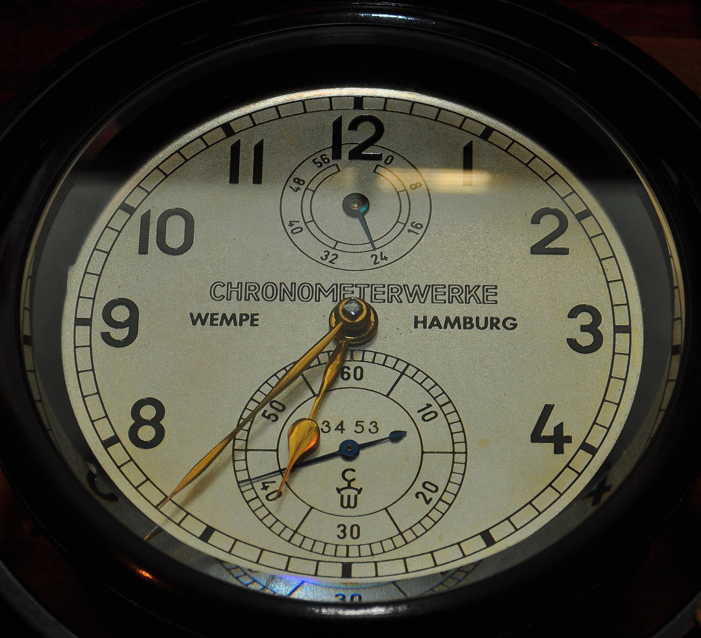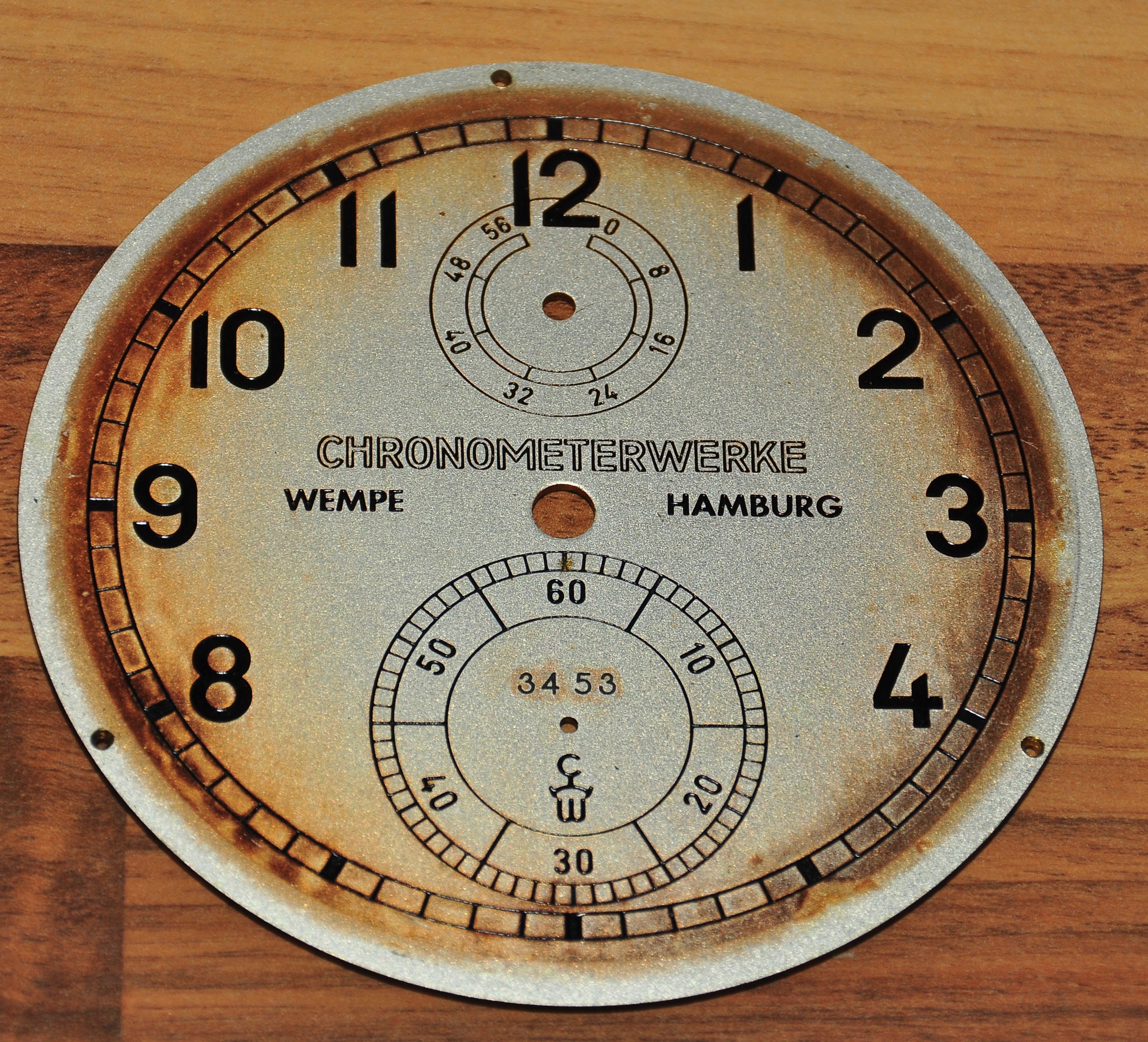 Das Zifferblatt des Wempe Ankerchronometer Nr: 3453 war im Bereich des Minutenring stark angelaufen, hier hat eine vorsichtige Reinigung und anschliessende Konservierung gereicht.