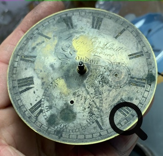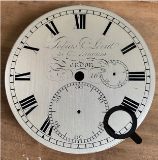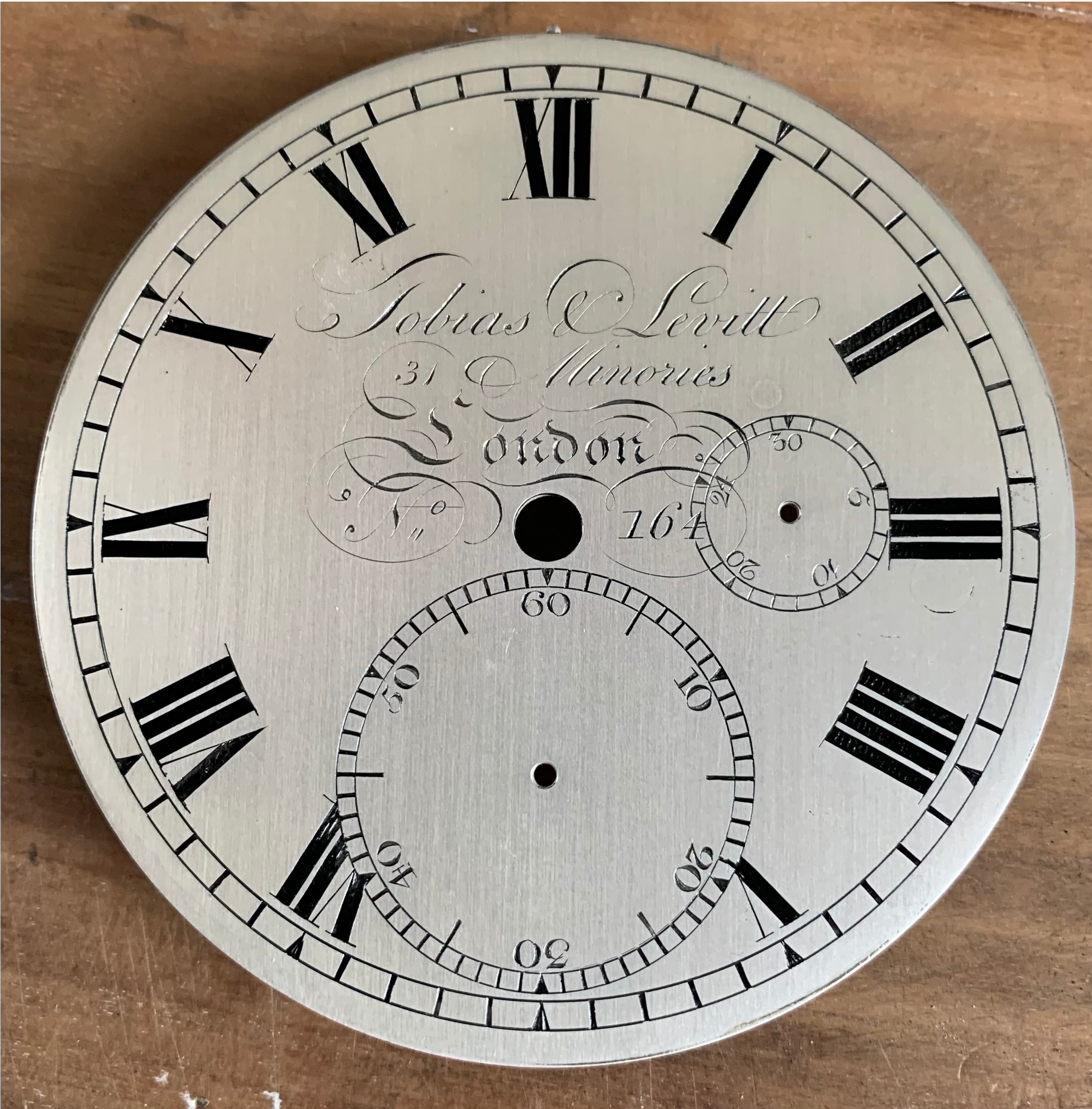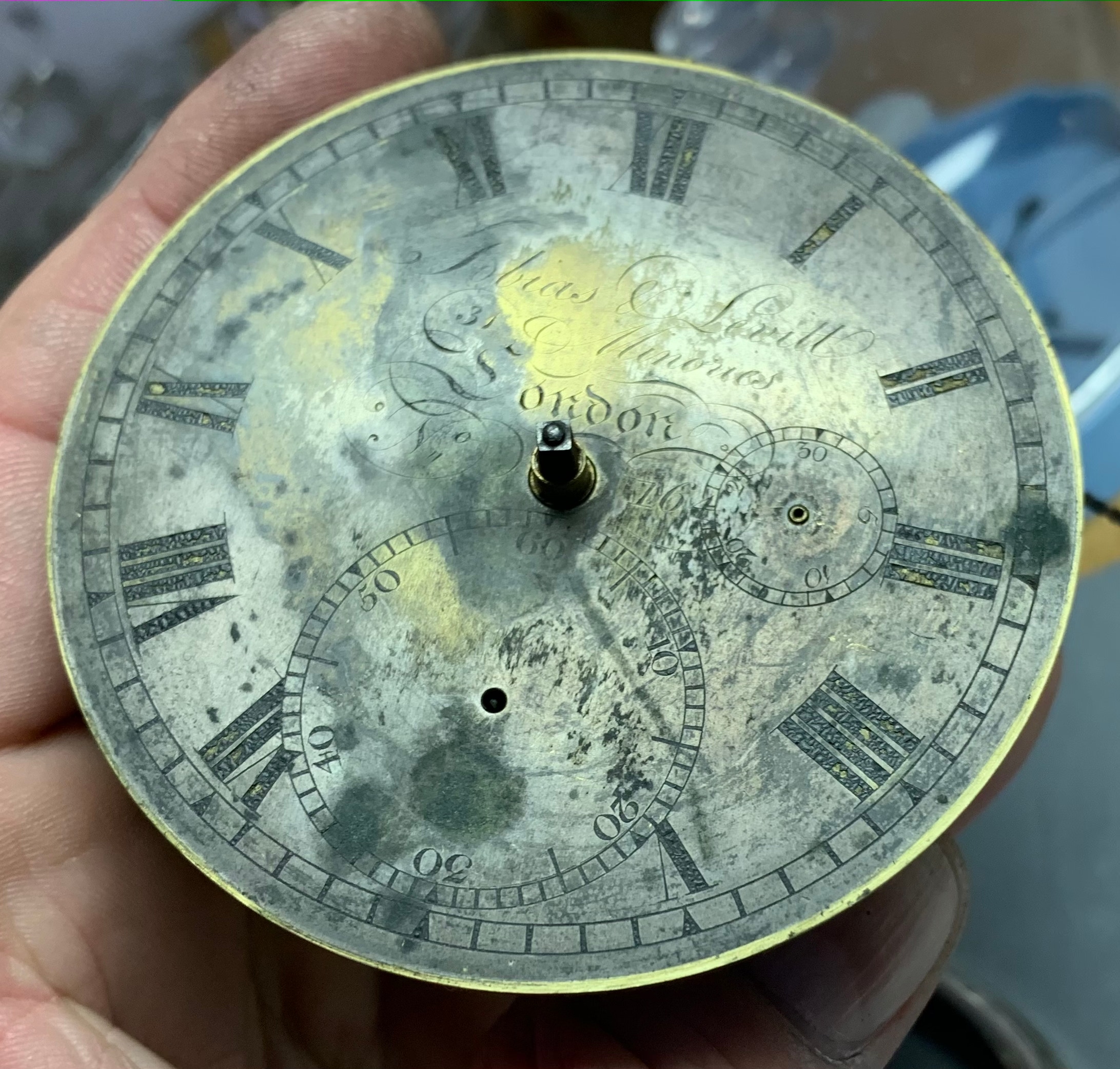 Hier das stark beschädigte Zifferblatt des Marinechronometer T. Levitt Nr: 164 Das selbe Zifferblatt nach der Restaurierung.