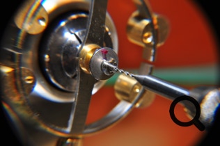 Bei dem Wempe Ankerchronometer Nr. 3453 musste im Rahmen der Revision ein Zapfen in die Uhruhwelle neu eingebohrt werden. In dem Video rechts sieht man wie schön es jetzt wieder läuft.