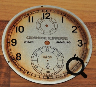 Das Zifferblatt des Wempe Ankerchronometer Nr: 3453 war im Bereich des Minutenring stark angelaufen, hier hat eine vorsichtige Reinigung und anschliessende Konservierung gereicht.